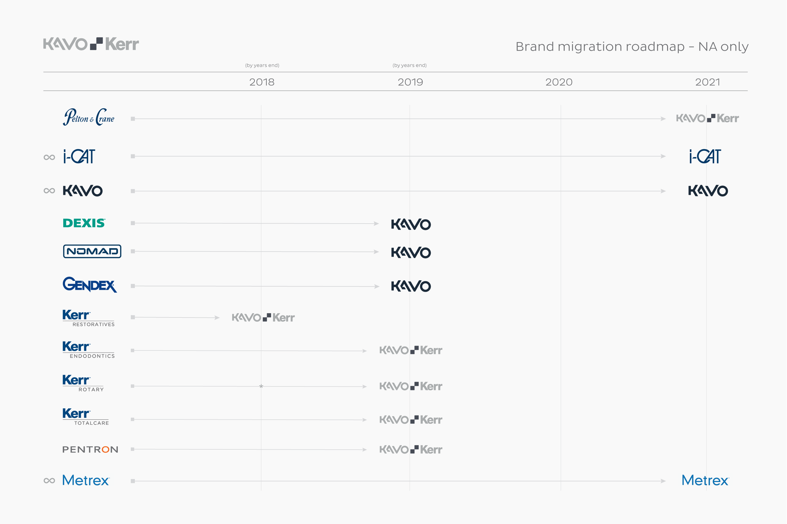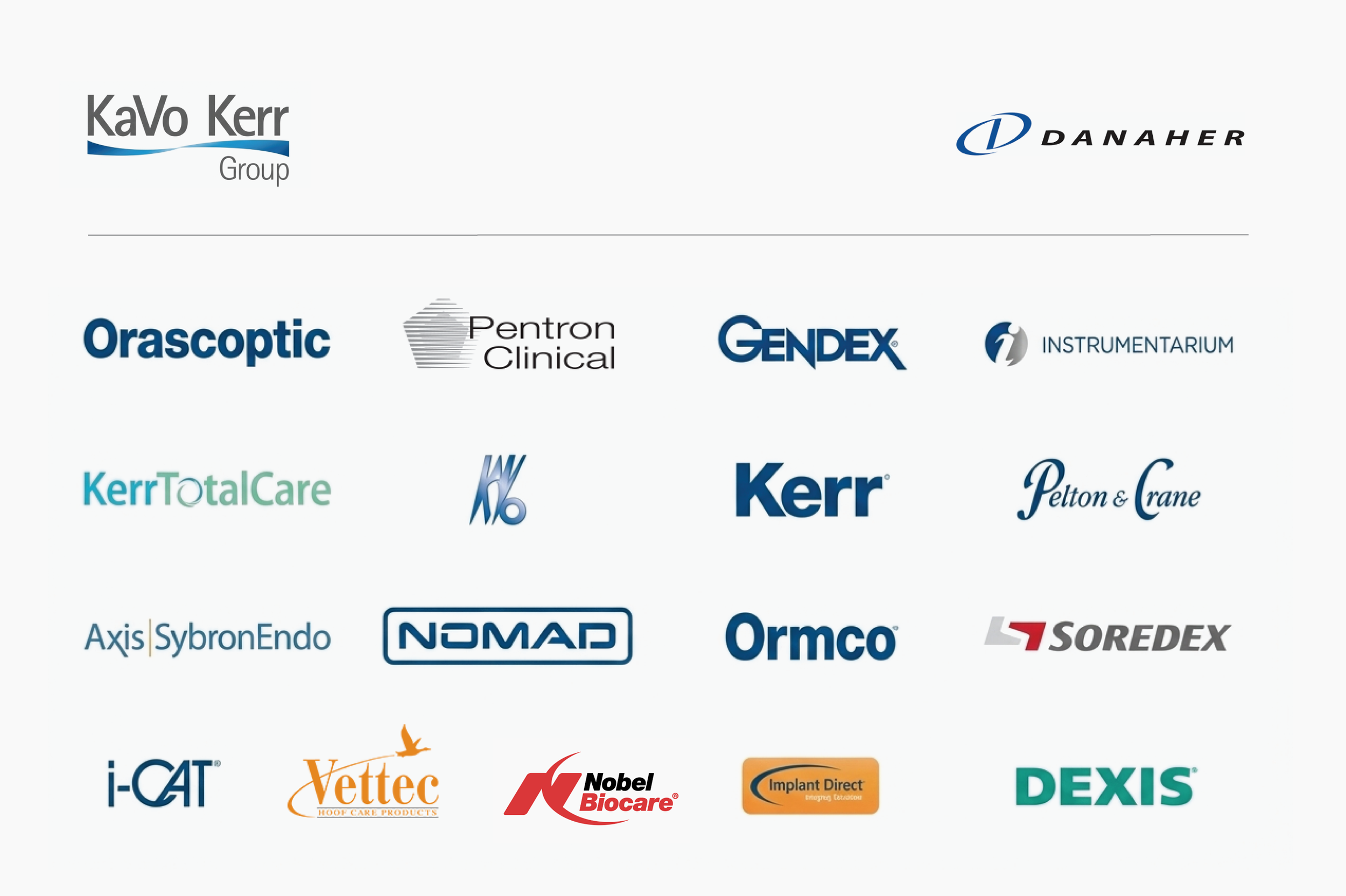 The decision was made at the Danaher Executive level to formalize what for years was an “internal only” name. The KaVo Kerr Group would be shortened to KaVo Kerr and be the new parent company that all the sales teams would sell under. The exceptions were Nobel Biocare, Ormco and Metrex, which operated in the lab, hygiene and ortho space. They were left stand alone. Of note, the decision to keep the logos intact and combine them was a Danaher level mandate.