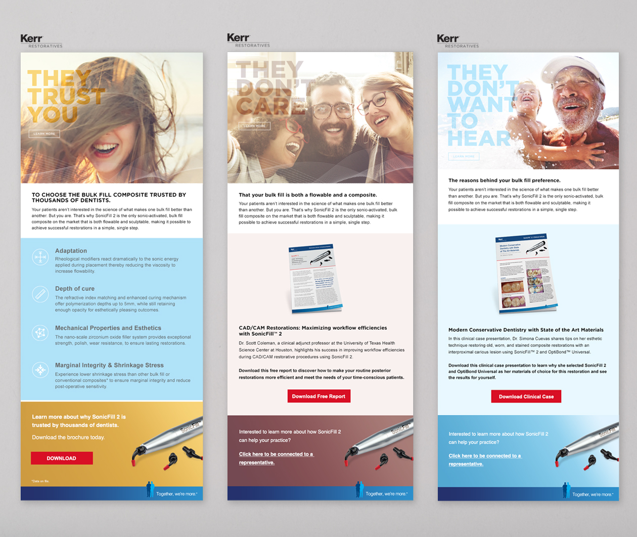 SonicFill, the market leader in bulk fill composites, was in need of a new messaging campaign to breathe some life into a brand that was starting to lose it's luster. By approaching it from the consumers perspective, we were able to tell the story more distinctly and succinctly than ever before. They (we), trust that dentists will use the best material in our mouth without ever asking for it by name. And that material is SonicFill.